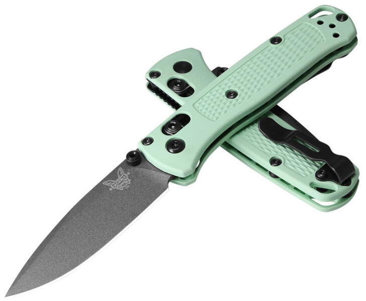 Grivory (rendkívül erős és könnyű kompozit) markolat Sea Foam színben. A kés mindkét oldalán megfordítható, felcsúsztatható klippel rendelkezik. A kés ezért jobb- és balkezes felhasználók számára egyaránt alkalmas. Tengelyzár, nagy nyílás a zsinórlyukhoz. Egykezes nyitás a pengén lévő csap segítségével. A kés az USA-ban készült. Benchmade kések