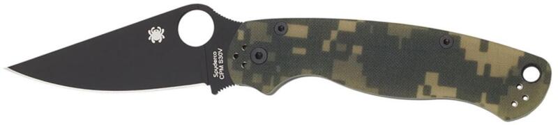 A Spyderco PARA MILITARY 2 G-10 Digital Camo zsebkés számos módosítással rendelkezik a klasszikus verzióhoz képest. A G-10 anyagból készült markolat vége keskenyebb, ami javítja az ergonómiát. A penge anyaga a jól ismert CPM S30V rozsdamentes acél, amely magasan teljesít, és a profilja vékonyabb lett, továbbá a hegyét meghosszabbították, míg a markolat mindkét oldalán további textúra került hozzáadásra a megszorításhoz.