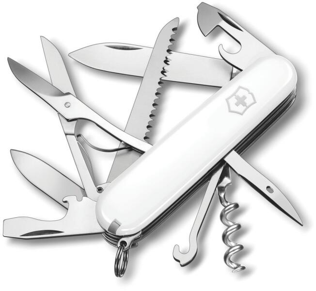A Victorinox Huntsman újabb kés a legendás Swiss Army Knife szériából. A kés mérete 91 mm és súlya 97 g. A markolat két oldala fehér. 15funkciót tartalmaz: